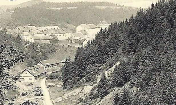 Pour avoir une idée de la superficie du bâtiment, j’ai repris une carte postale de la collection Francis Glaude. Elle montre l’accès à la ville de Houffalize par la rue Moulin Lemaire. A l’avant, la remise aux locomotives et juste derrière la remise aux voitures (usine Schaefer).