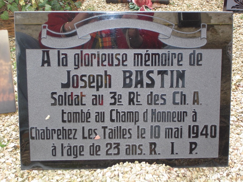 « Ici aussi le destin est venu se choisir une victime, Joseph Bastin, soldat aux Chasseurs Ardennais tombé à Chabrehez-les Tailles le premier jour de la guerre. Ce jeune héros était âgé de 22 ans. »