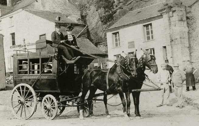 [v] La malle-poste était une voiture hippomobile destinée à l’origine au transport des dépêches et du courrier en général, apparue en France vers 1800. La malle-poste peut transporter, en plus du courrier, des passagers. C’est donc une voiture plus lourde, fermée, à quatre roues, suspendue sur des ressorts, tirée par quatre ou cinq chevaux. La partie avant, le cabriolet, reçoit le cocher et un passager à côté de lui. Dans la partie centrale, le coupé, prennent place trois voyageurs. La partie arrière est la malle réservée au courrier. Source Wikipedia.