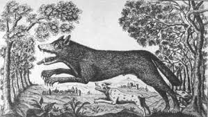 Deux loups énormes tiraient aux cordes des cloches en poussant des hurlements étouffés, et pour cause. Les fauves attirés par l’odeur de cheir fraiche, avaient suivis la piste du mégligeant Blancou. Dans le porche, ils s’étaient jetés sur les cordes encore pleines de sang et les prenant pour des boudins, avaient essayé de les avaler. Les noeurds pratiqués au bout des cordes empêchaient lesdits boudins de sortir de l’estomac, et les loups tiraient, tiraient… ».