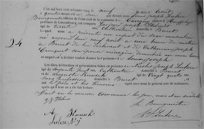 Il n’y a par contre aucun acte de naissance de Jean Stelmes vers les années 1805 dans les registres de la commune de Tavigny. Les Stelmes, manifestement cultivateurs de père en fils, proviennent sans doute du quartier germanophone de l’ancien duché de Luxembourg et sont arrivés, par fermage, à Buret.