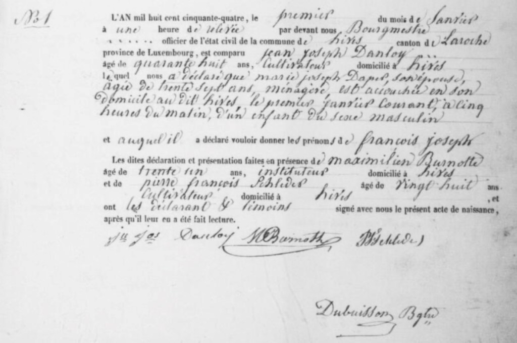 Notre nouveau François Joseph Danloy est né à Hives le 1er janvier 1854. Hives est actuellement une section de la ville de La Roche mais était une commune à part entière avant la fusion des communes de 1977.